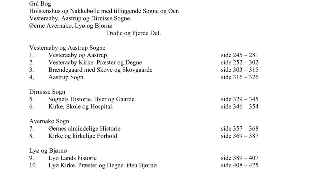 Han havde skrevet om huse og gårde fra Vester Aaby Sogn, Aastrup og Diernæs sogne, samt Avernakø og Lyø.